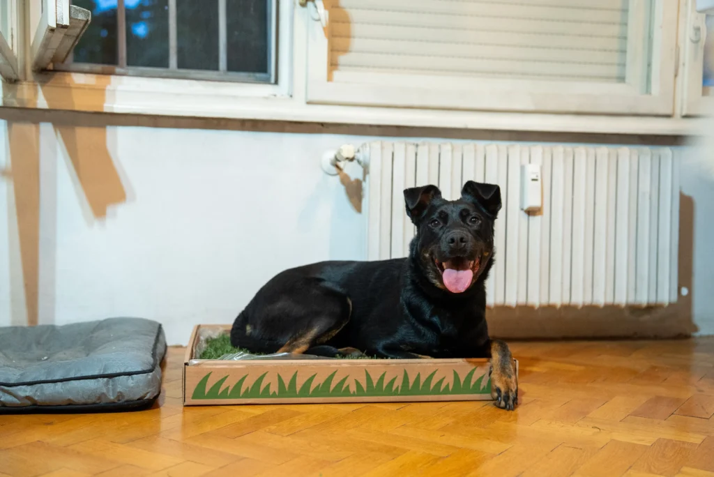 Това е органично тревно килимче, доставяно в кутия, което служи като естествена тоалетна за домашни любимци.
